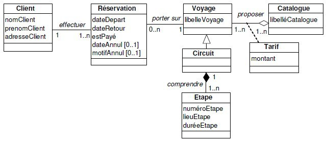 Exemple: La société propose des catalogues thématiques : un catalogue est une agrégation de voyages, mais un voyage peut être inséré dans plusieurs catalogues. En fonction du catalogue dans lequel il est inséré, le voyage pourra être proposé à des tarifs différents. Un client effectue une réservation par voyage. En cas d'annulation d'un voyage, la date et le motif sont mémorisés. Une réservation peut être payée ou non payée. Un type particulier de voyage est le circuit, d'où la création d'une spécialisation. Un circuit est une composition d'étapes, attachées au seul circuit et n'ayant aucun sens en dehors du circuit auquel elles sont rattachées.